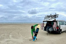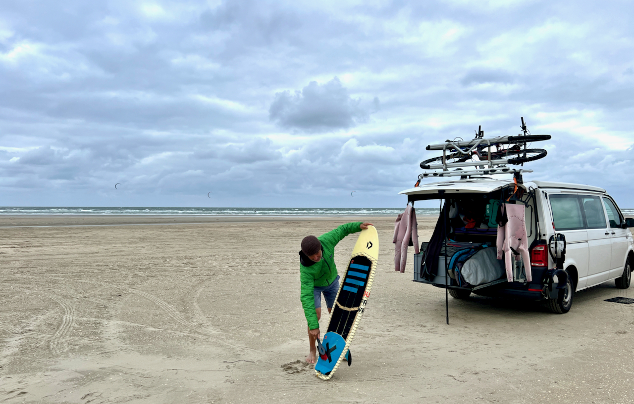 Wir cruisen mit dem Auto entlang der Westküste, alles flach, grün, sandig, unser erster Stopp Rømø, eine Insel mit ewig langem Sandstrand. Mit dem Auto kann man hier bis an die Wasserkante fahren… Kitesachen raus und ab auf‘s Wasser. Es ist nicht viel los, es gibt nette kleine Wellen und das Wasser ist erstaunlich warm. Heute ist Österreichs Viertelfinaltag, aber das interessiert in Rømø niemanden, so bleibt uns das Handy und „Private Viewing“ für die zweite Halbzeit im Bus.