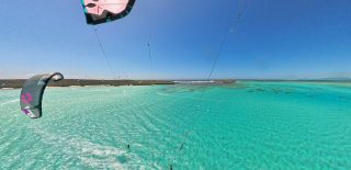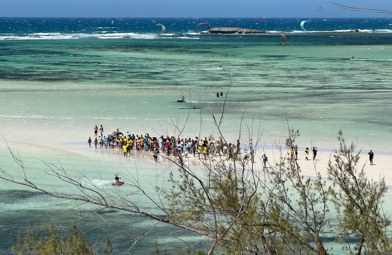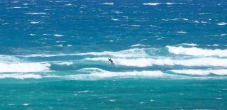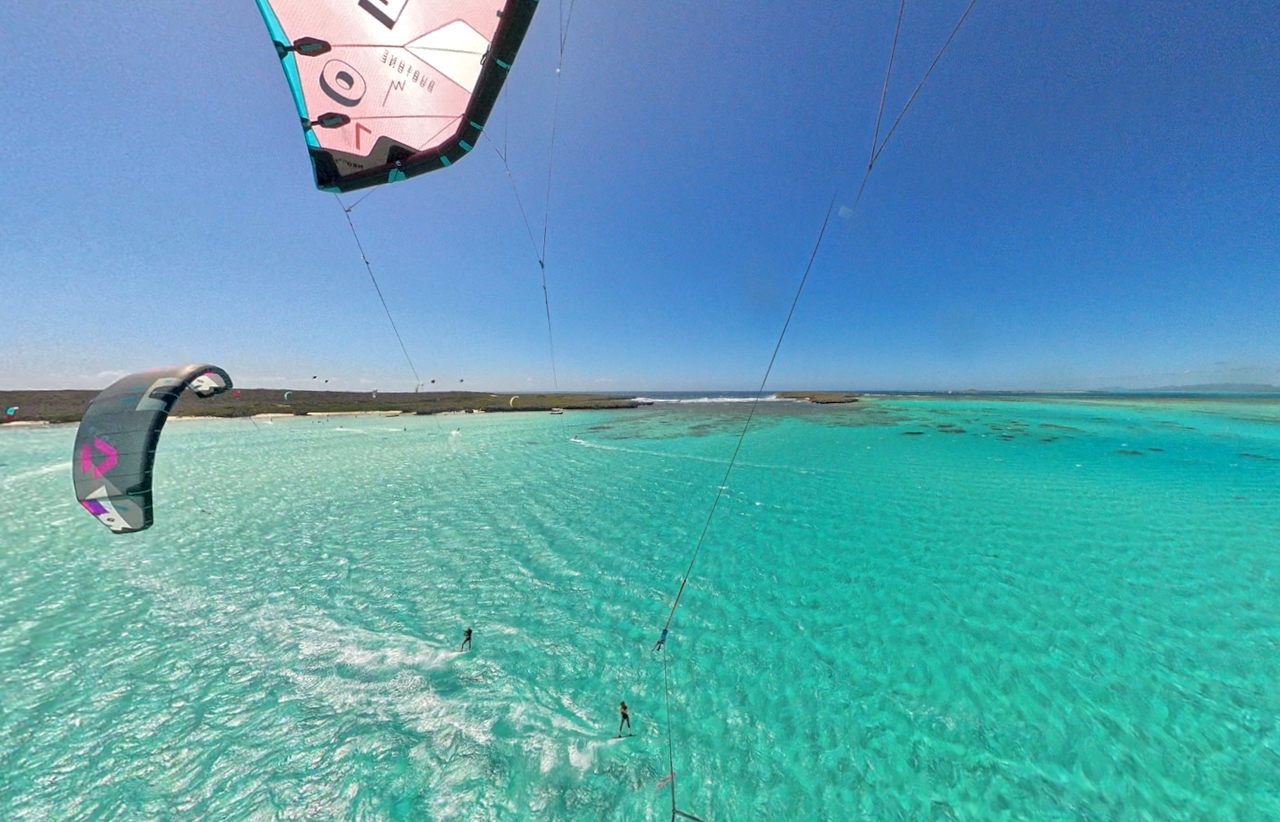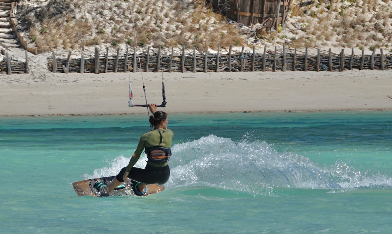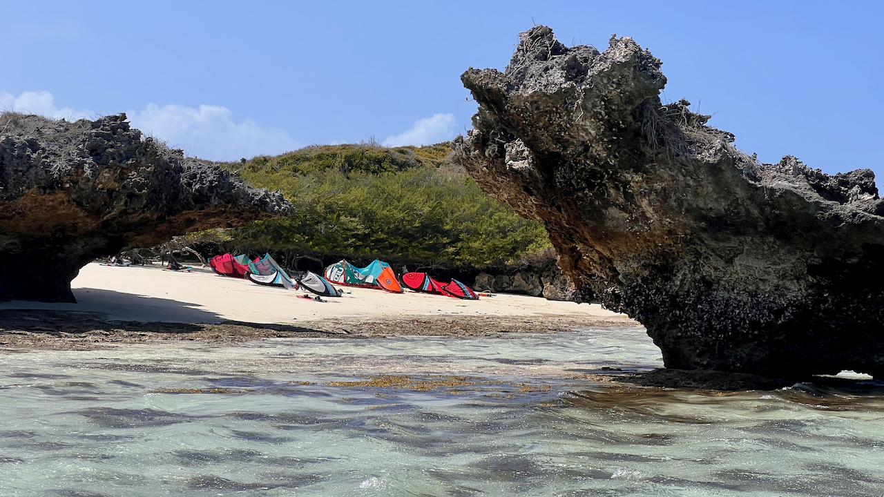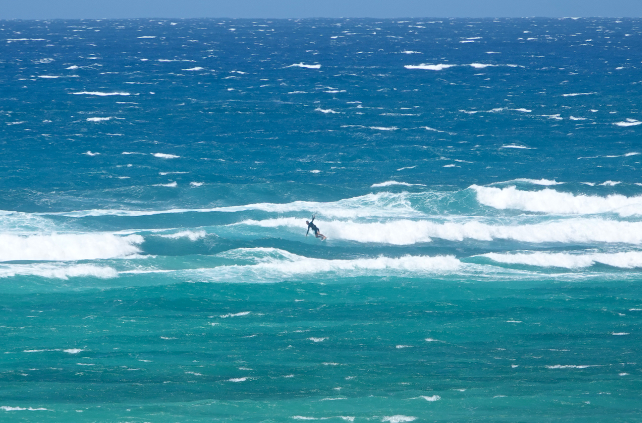 Das Kiten war, abhängig vom Wasserstand und den Windbedingungen, vielfältig, jedoch immer bei viiieeel Wind. Unglaubliches Kabbelwasser (bei Flut), wechselte mit spiegelglattem Wasser hinter der Sandbank (bei Ebbe). Die Welle lief am besten bei auflaufendem Wasser vor dem Höchststand, sobald das Riff nicht mehr zu knapp unter der Wasseroberfläche war. Bald hatten wir uns auch an die 5 m2 Schirme, die wir fast ausschließlich flogen, gewöhnt.